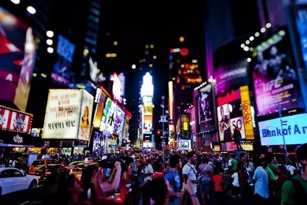 时代广场位于曼哈顿中城西部与百老汇大道交汇处。周边高楼密集,聚集无数商场和剧院,是繁盛的娱乐和购物中心,也是纽约的标志。无论白天黑夜,街道两旁的霓虹广告和大屏幕宣传板都吸引着人们的眼球,反射着曼哈顿强烈的都市特性。这里每天约有七万人次的高密度人流,涌动着不同肤色、不同民族的行人,跻身于此便可感受那疯狂膨胀到无限的缤纷世界。广场每年最着名的活动便是新年倒计时,每到辞旧迎新之时,都会有超过50万人汇集于此,共度不眠夜。