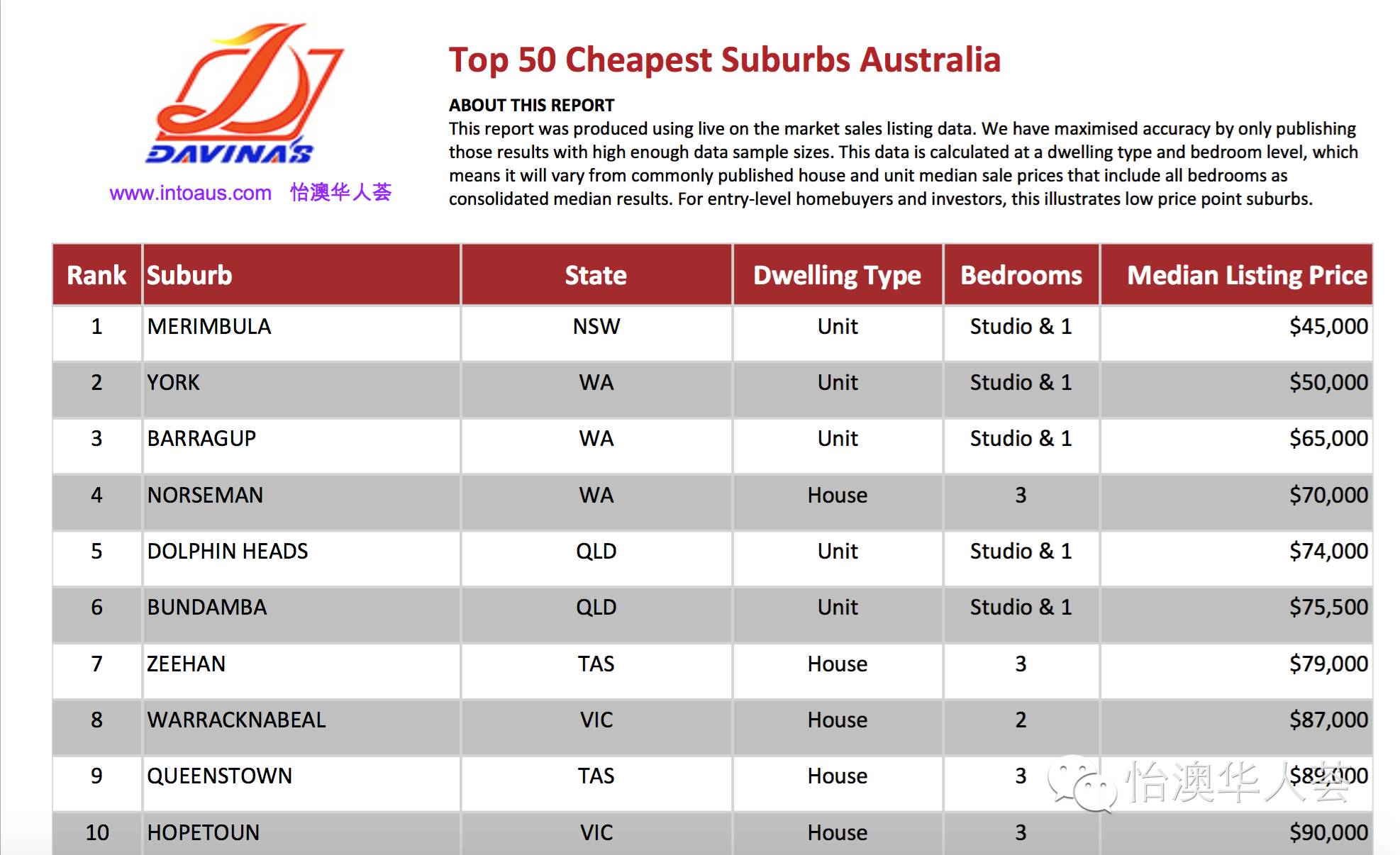 《澳洲房价最便宜前50区》